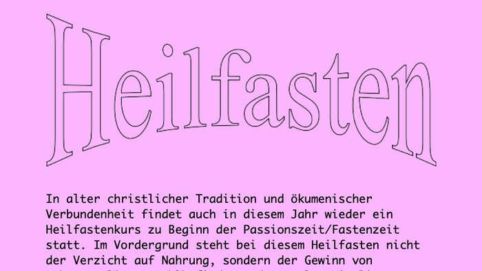 In alter christlicher Tradition und ökumenischer Verbundenheit findet auch in diesem Jahr wieder ein Heilfastenkurs zu Beginn der Passionszeit/Fastenzeit statt. Im Vordergrund steht bei diesem Heilfasten nicht der Verzicht auf Nahrung, sondern der Gewinn von Lebensqualität, Wohlbefinden und mentaler Vitalität.